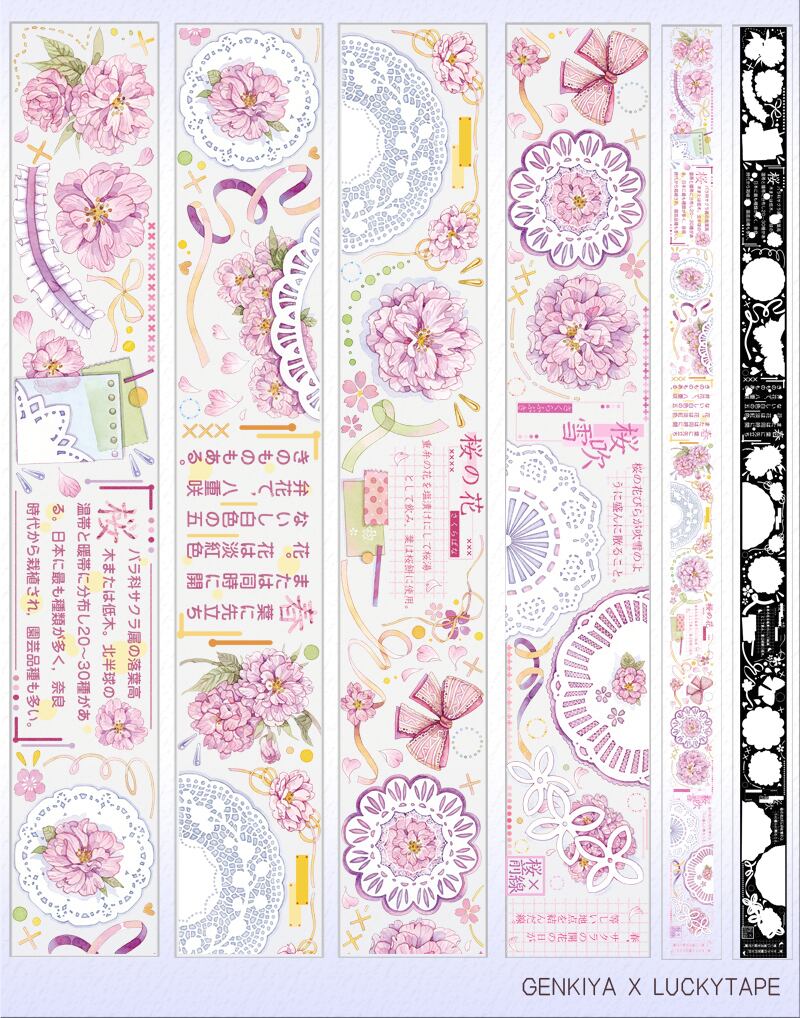 再販☆LT44 LUCKYTAPE x genkiya (桜花花塾) 幅広5cm 白墨特殊油墨 剥離紙付 光沢PETテープ | cherish365_zakka